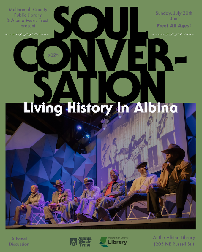 Soul Conversation is a panel discussion featuring Albina's music legends and moderated by Juma Sei of the 1803 Fund. Musicians played a vital role in Albina's historic Black community and their abundance is an important marker of the community's enduring presence. This unique gathering of elders sheds light on Albina's cultural heritage, with a nod to the future of Black Portland. The discussion features Ken Berry, Bill Deiz, Paul Knauls, Norman Sylvester, and Calvin Walker. AMT's archival photography will be presented in conjunction with the conversation.
